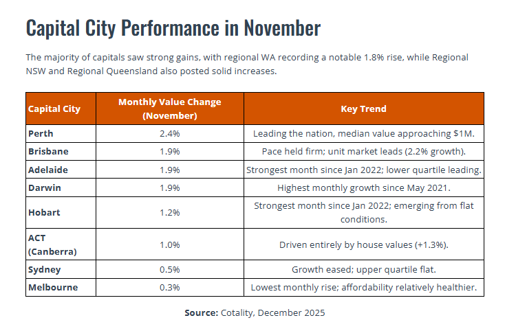 Mid-Sized Cities Lead the Surge: Perth (2.4%), Brisbane (1.9%), and Adelaide (1.9%) led the market, while Sydney (0.5%) and Melbourne (0.3%) saw a deceleration in growth.